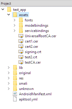 Opening the APK with a tool such as APK Studio makes the presence of certificates bundled with the deployed application obvious. In the image above, the certificates are located under the ‘assets’ directory. Overwriting the aptly-named ‘UniversalRootCA’ certificate with our custom CA should allow us to trick the application into accepting our certificate.